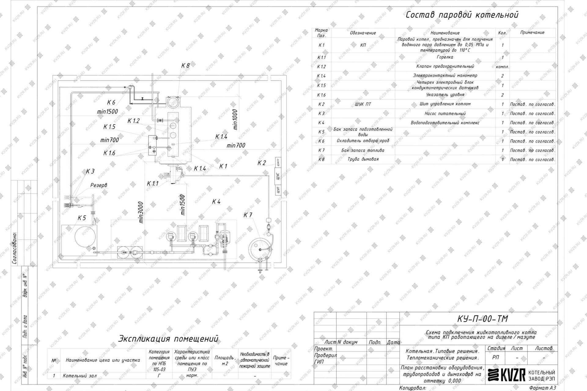 Чтобы правильно подключить мазутный паровой котел 1600 кг / 1.6 т пара -115 °С -0,07 МПа / 0,7 кгс/cм² в котельной необходимо оставить проемы для обслуживания оборудования во время эксплуатации. На представленной здесь схеме обозначены их размеры. Кроме того, в данной примерной схеме монтажа паровых котлов и оборудования указан перечень минимально необходимого вспомогательного оборудования.
