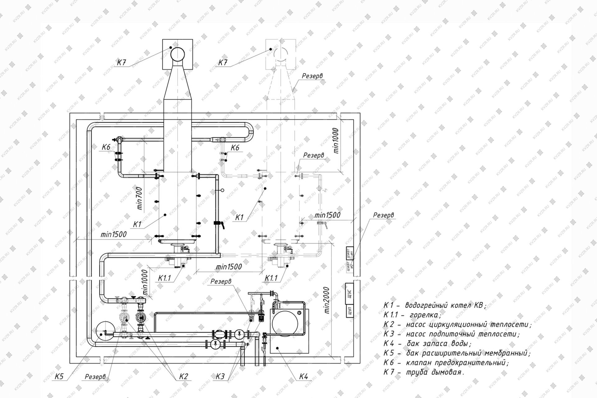 Чтобы правильно подключить котел КВа 0,15 в котельной необходимо оставить проемы для обслуживания оборудования во время эксплуатации. На представленной здесь схеме указаны их минимальные размеры. Кроме того, в данной примерной схеме монтажа водогрейных котлов и оборудования указан перечень минимально необходимого вспомогательного оборудования для правильной работы котла.
