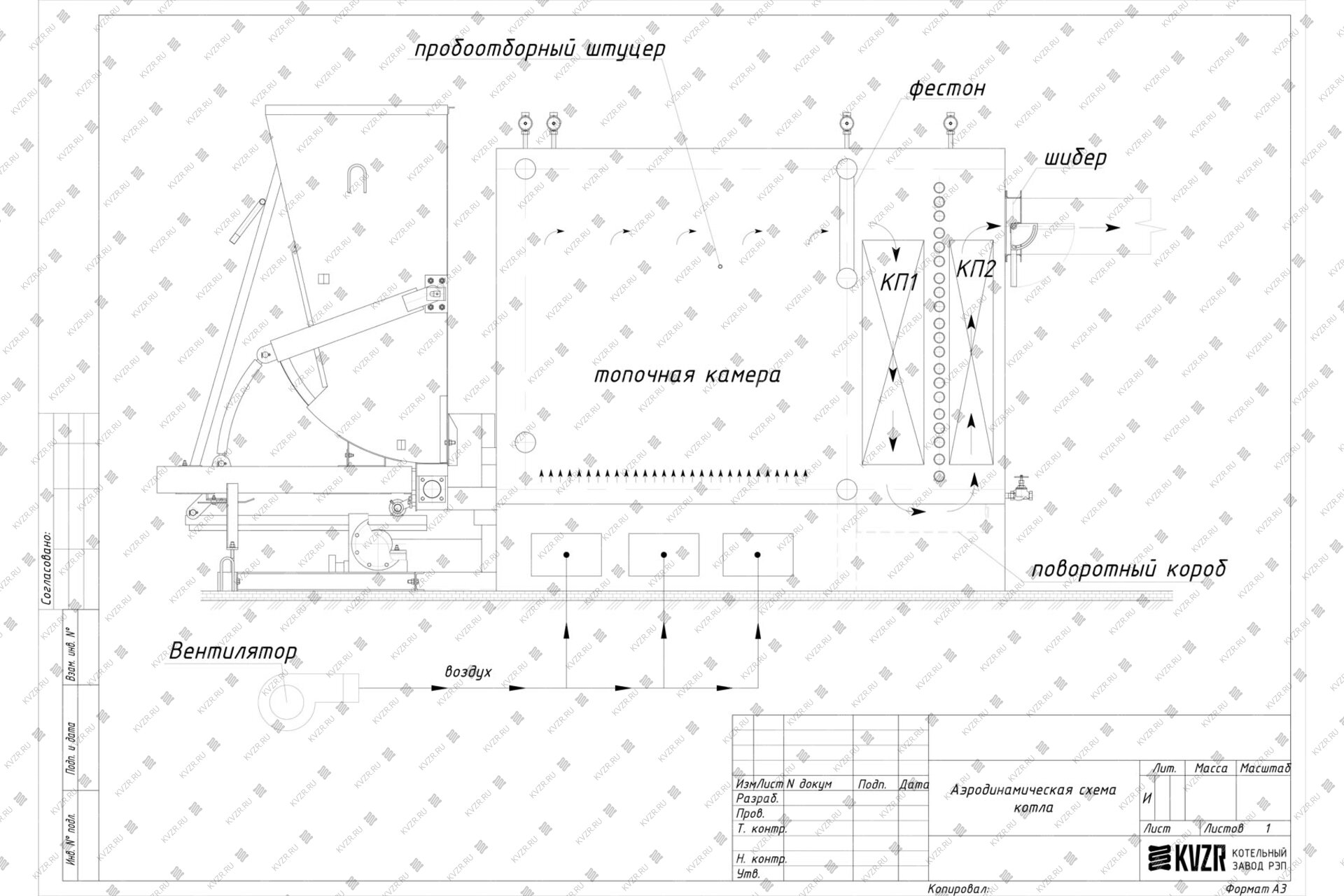 Воздух в механический водогрейный котел КВм-1.0 с ТШПМ подается вентилятором поддува через топочный короб под слой твердого топлива для обеспечения горения. На боковой панели топки котла имеется пробоотборочный штуцер для подключения манометра и тягонапорометра.