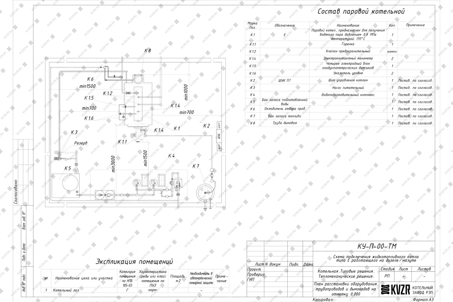 Чтобы правильно подключить дизельный паровой котел 500 кг / 0.5 т пара -130°С -0,17 МПа / 1.7 кгс/cм² в котельной необходимо оставить проемы для обслуживания оборудования во время эксплуатации. На представленной здесь схеме обозначены их размеры. Кроме того, в данной примерной схеме монтажа паровых котлов и оборудования указан перечень минимально необходимого вспомогательного оборудования.