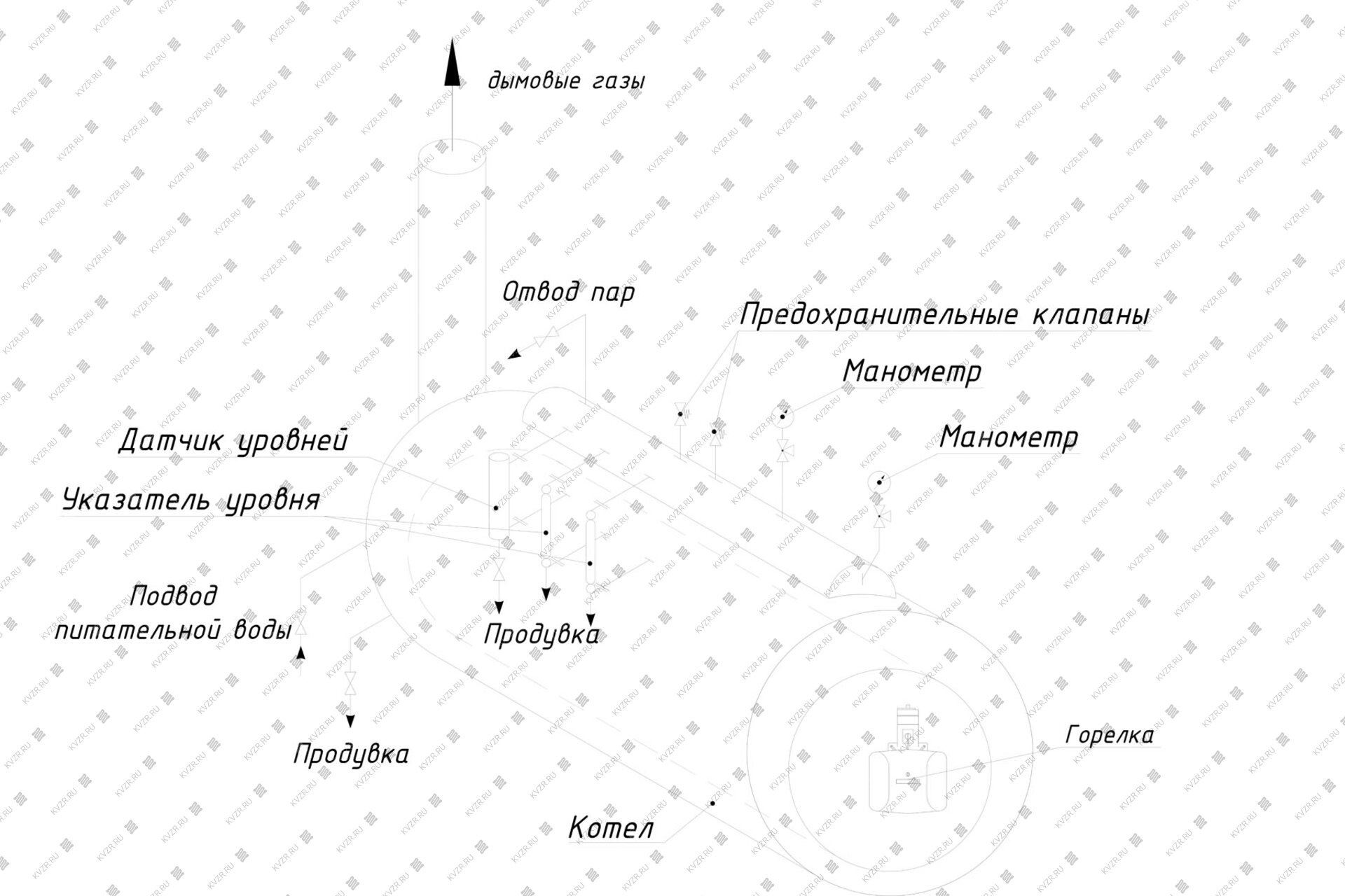 Паровые котлы 500 кг 130 °С на дизеле комплектуются манометром, водомерной колонкой с водомерным стеклом, двумя предохранительными клапанами, паровыми и продувочными вентилями.