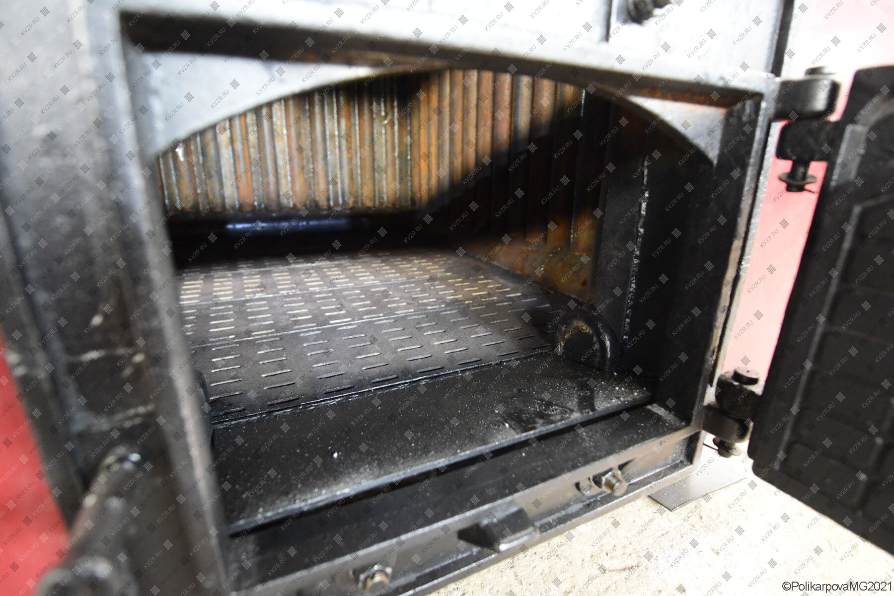 Горение древесного топлива в ручном котле осуществляется на колосниковой решетке из чугуна со специальными отверстиями для золы. Зола, проваливаясь сквозь эти отверстия, подпадает в короб. Еще один такой короб располагается под конвективной частью. Для рациональной загрузки топлива фронтовая плита оснащается двумя загрузочными дверцами, расположенными друг под другом. Также для облегчения загрузки большего количества топлива топка выполняется в увеличенном размере, что способствует и лучшему сгоранию мелких и летучих частиц.