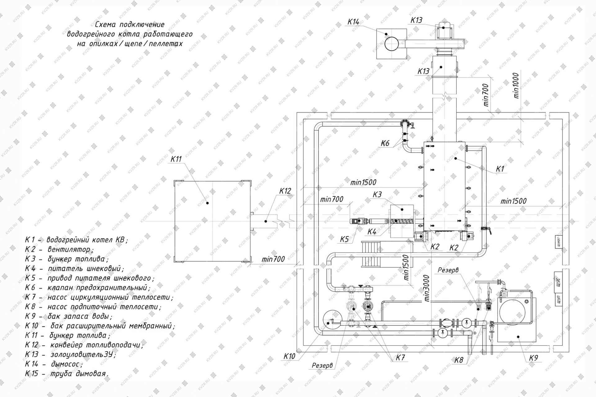 Чтобы правильно подключить пеллетный котел 0.35 МВт в котельной необходимо оставить проемы для обслуживания оборудования во время эксплуатации. На представленной здесь схеме указаны их минимальные размеры. Кроме того, в данной примерной схеме монтажа водогрейных котлов и оборудования указан перечень минимально необходимого вспомогательного оборудования для правильной работы котла.