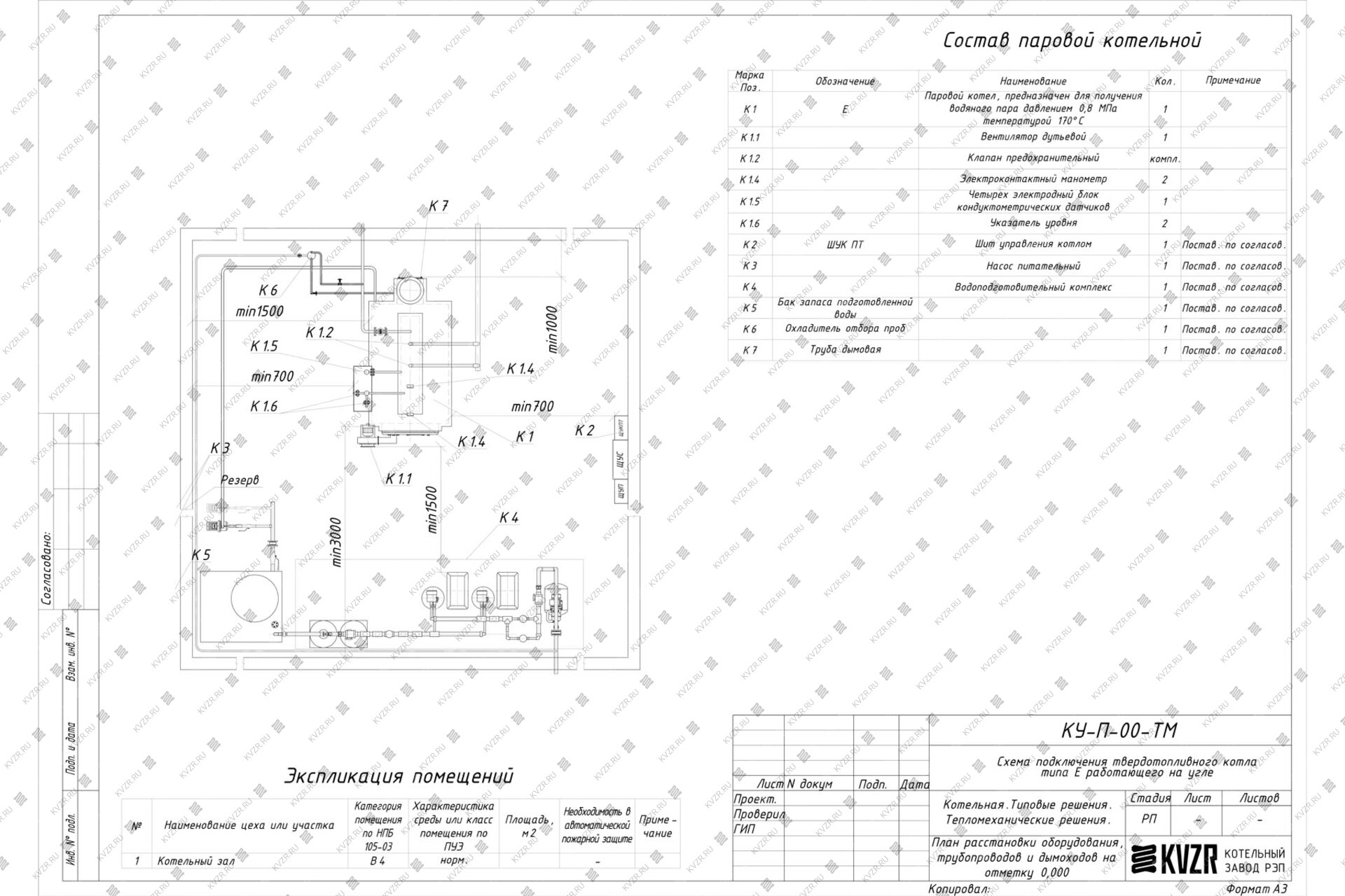 Чтобы правильно подключить угольный паровой котел 500 кг / 0.5 т пара -170 °С -0,9 МПа / 9 кгс/cм² в котельной необходимо оставить проемы для обслуживания оборудования во время эксплуатации. На представленной здесь схеме обозначены их размеры. Кроме того, в данной примерной схеме монтажа паровых котлов и оборудования указан перечень минимально необходимого вспомогательного оборудования.