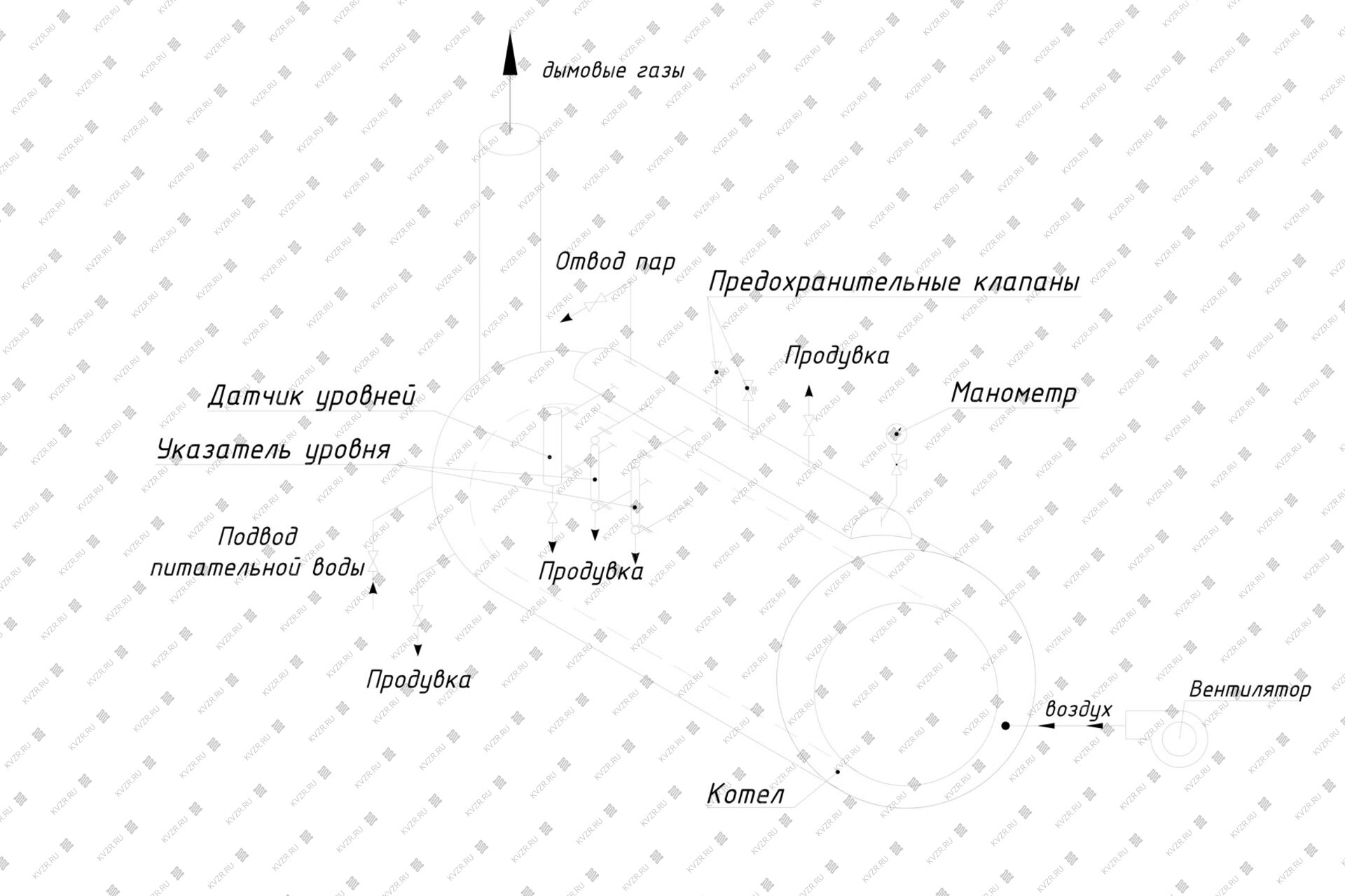 На котле имеются продувочные штуцера Ду25, Ду15 и Ду10. Штуцер Ду25 предназначен для удаления шлама, образующегося в результате работы котла, периодической продувки котловой воды и для спуска воды в случае необходимости. Штуцер Ду15 предназначен для продувки водомерной колонки. Штуцера Ду10 предназначены для продувки указателей уровня.